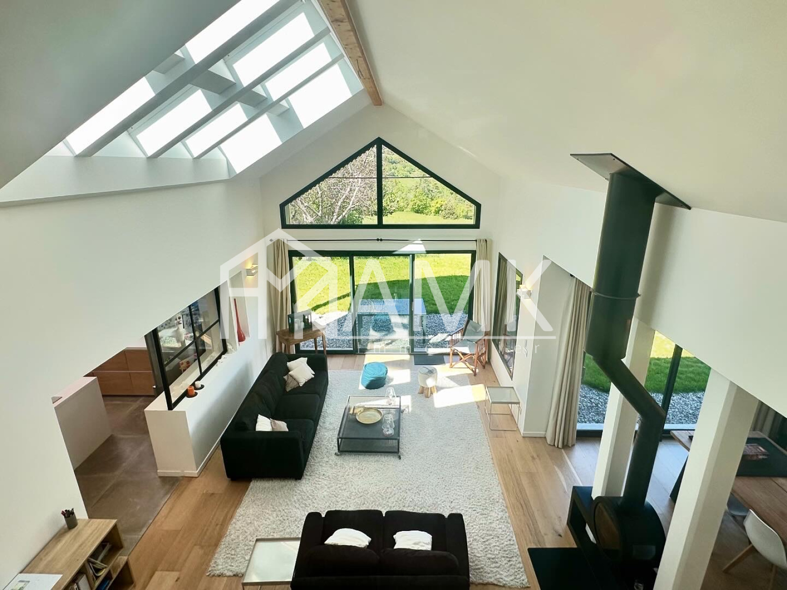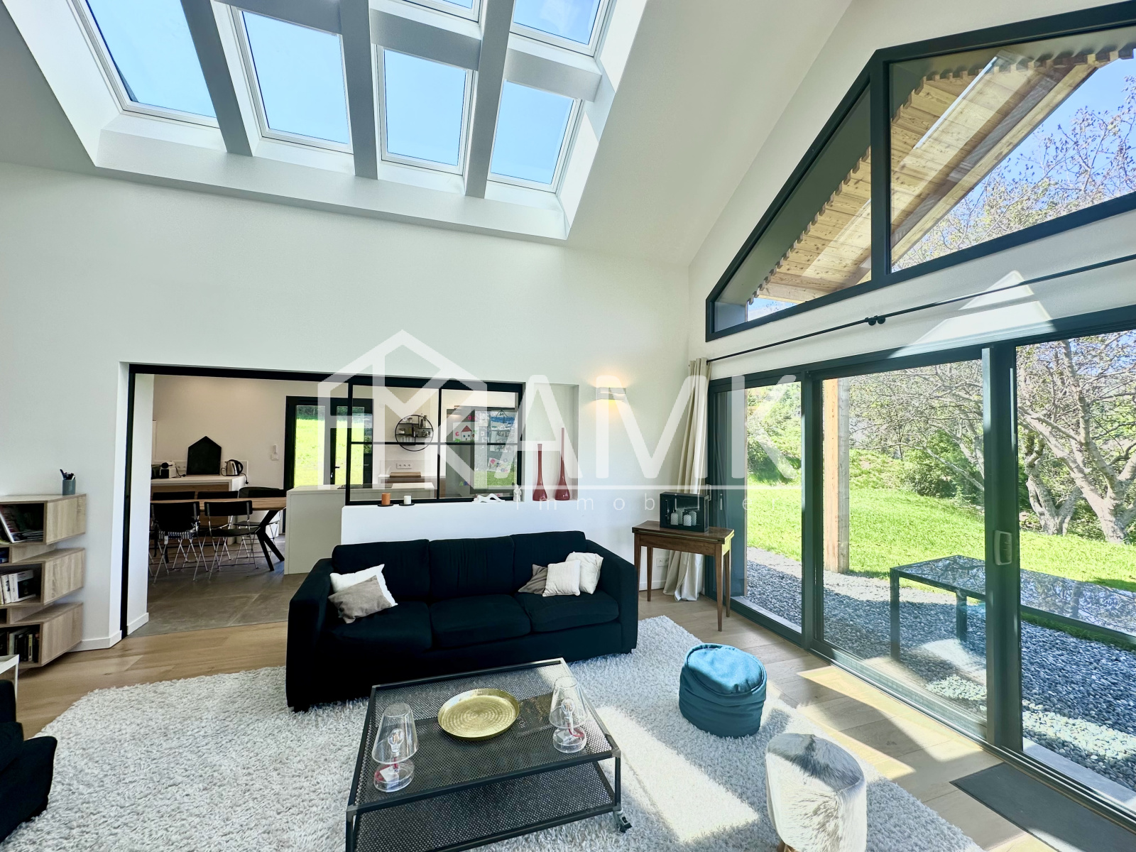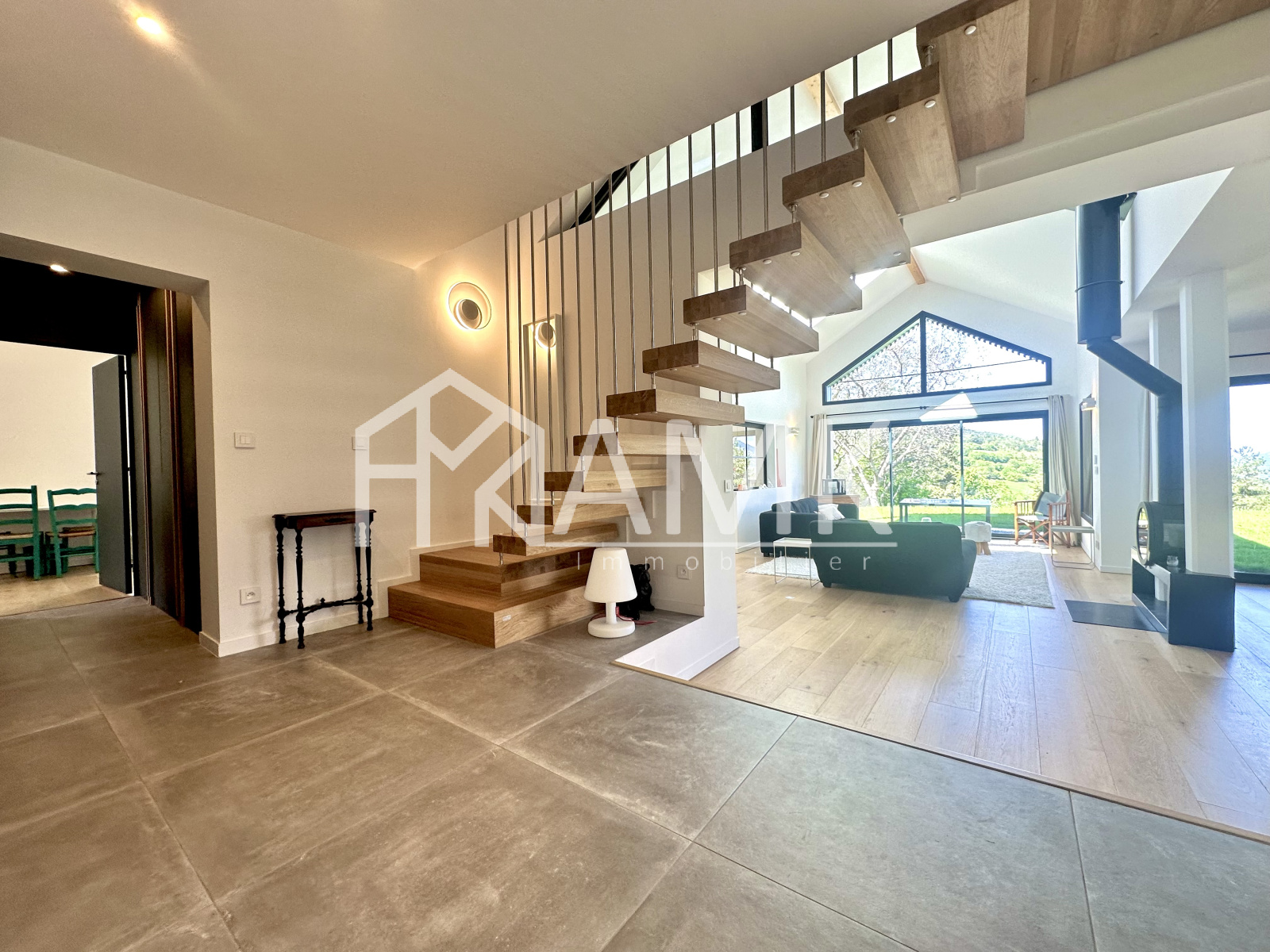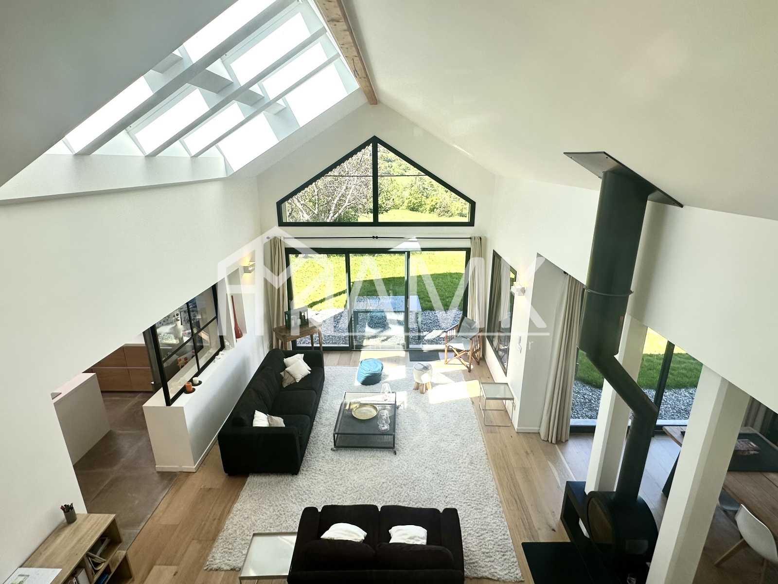 -grande pièce de vie avec hauteur sous plafond ;
