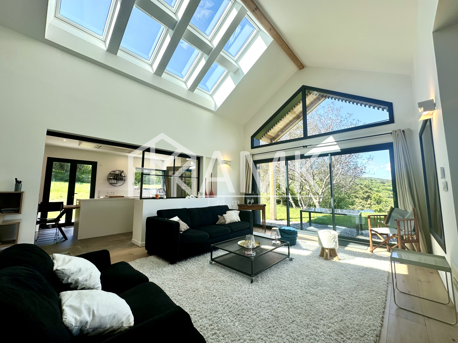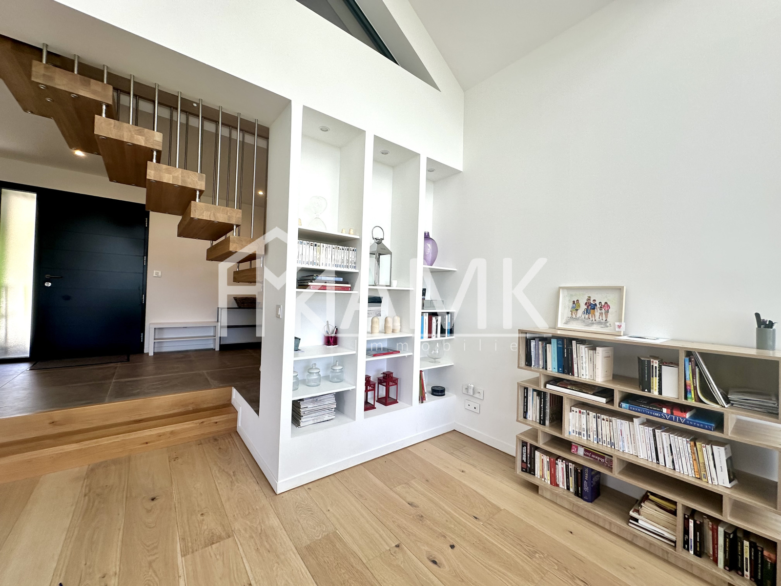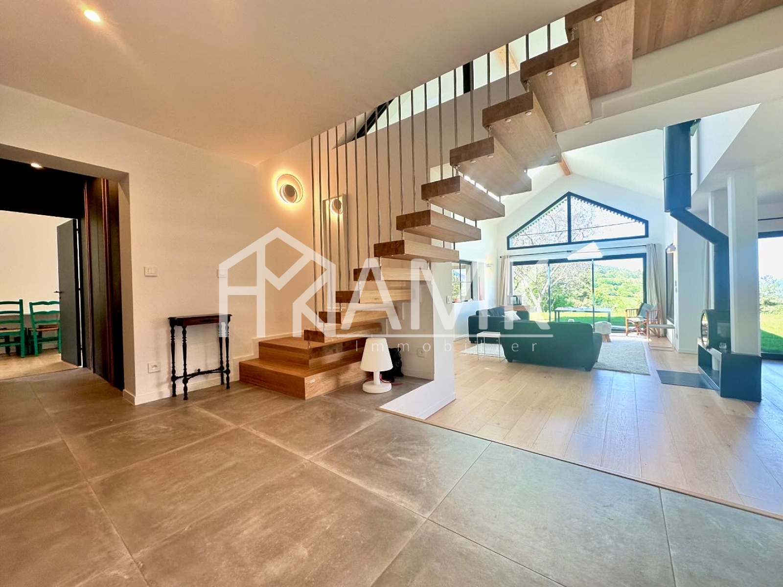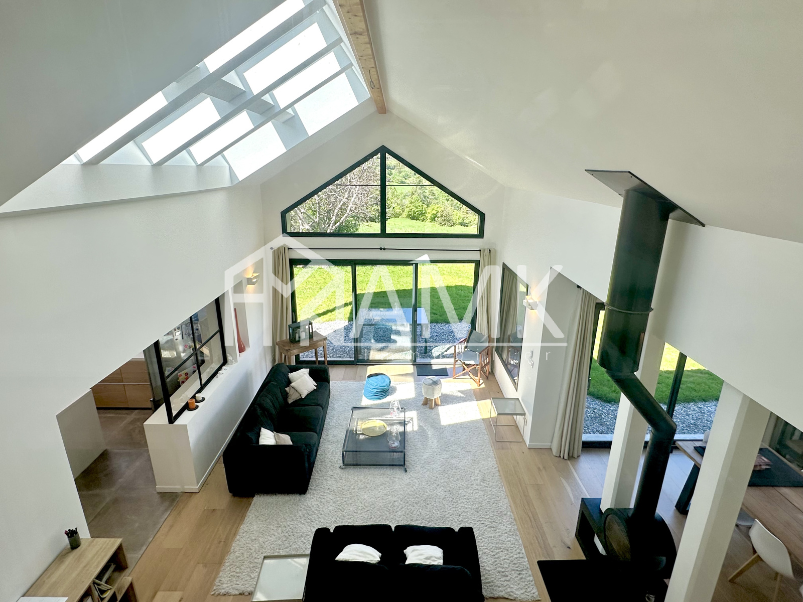 -grande pièce de vie avec hauteur sous plafond ;