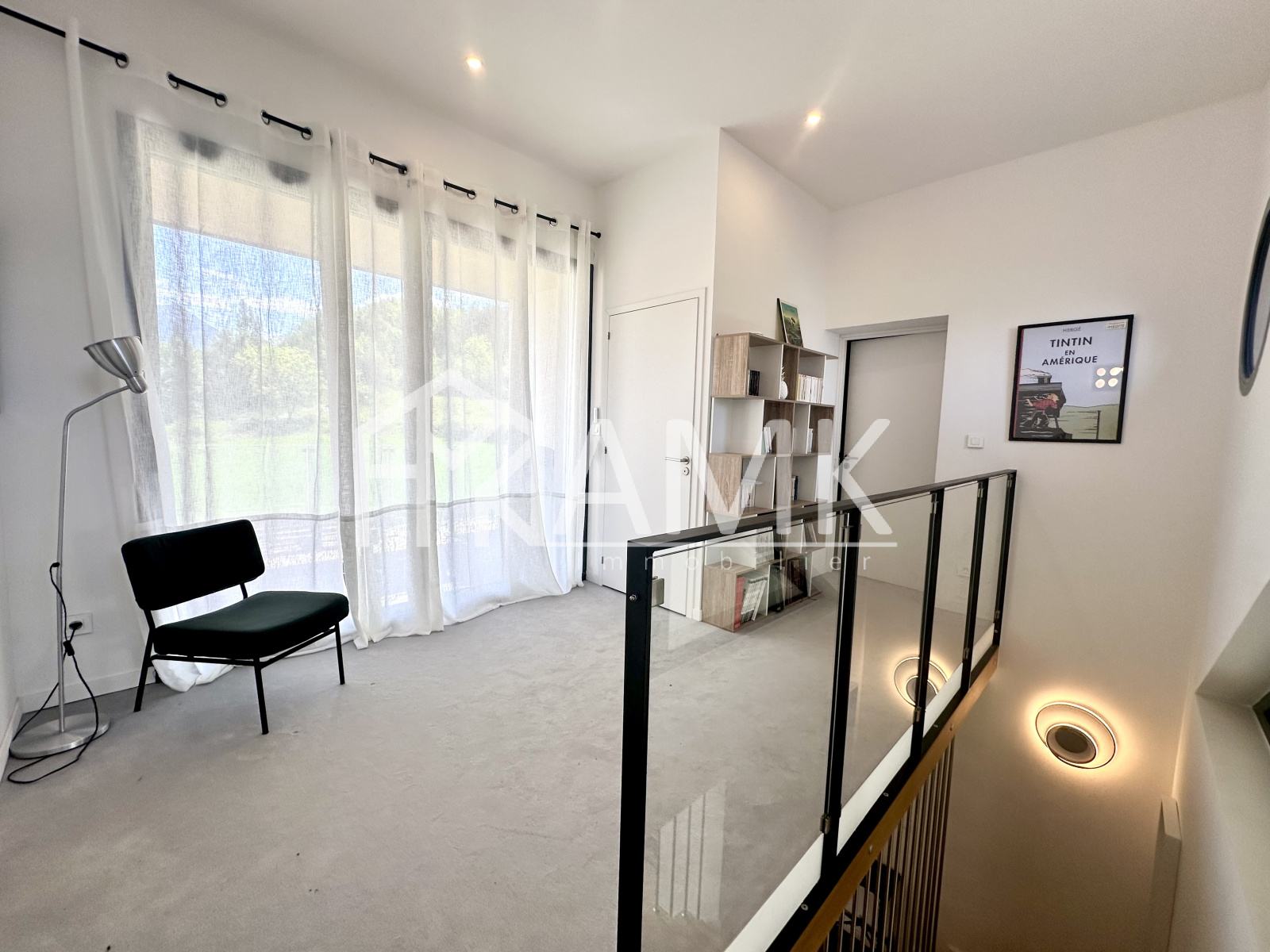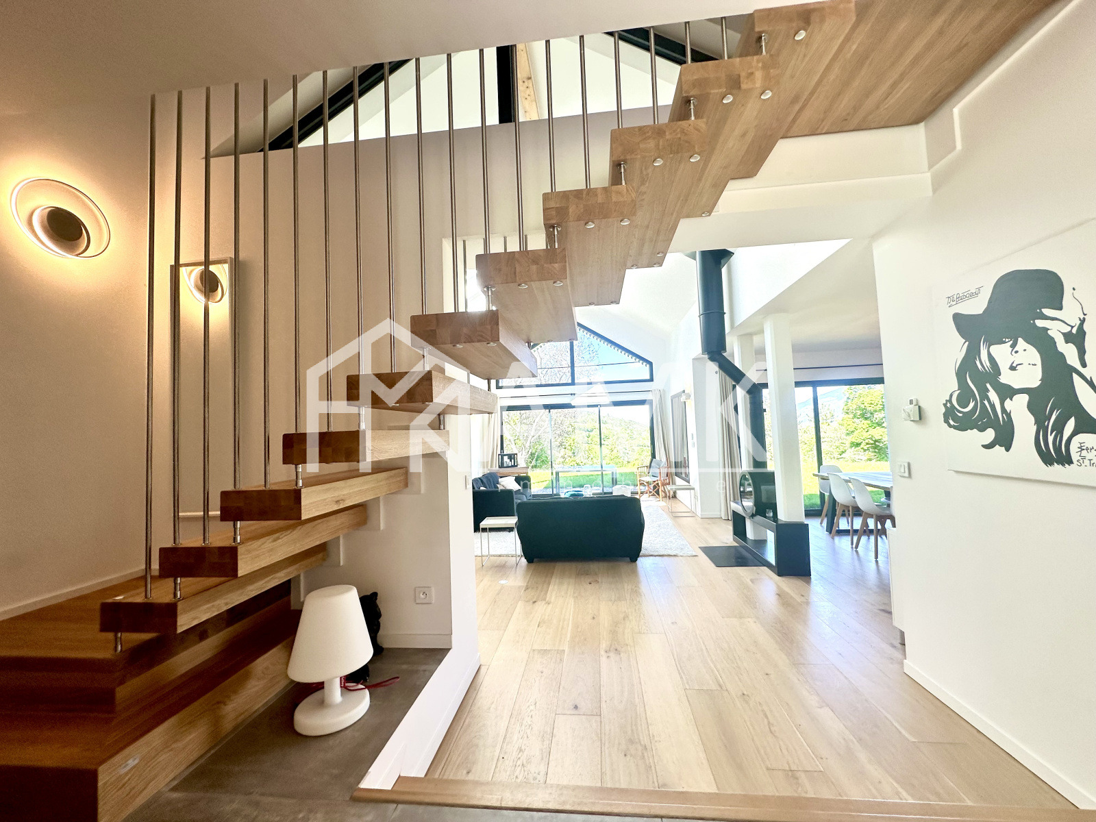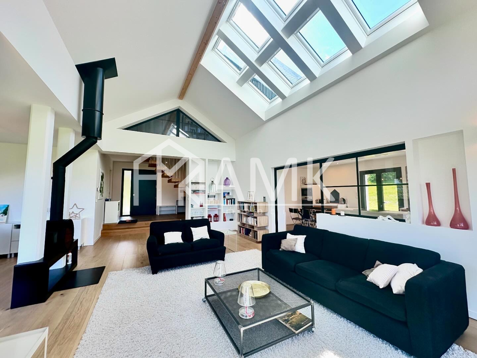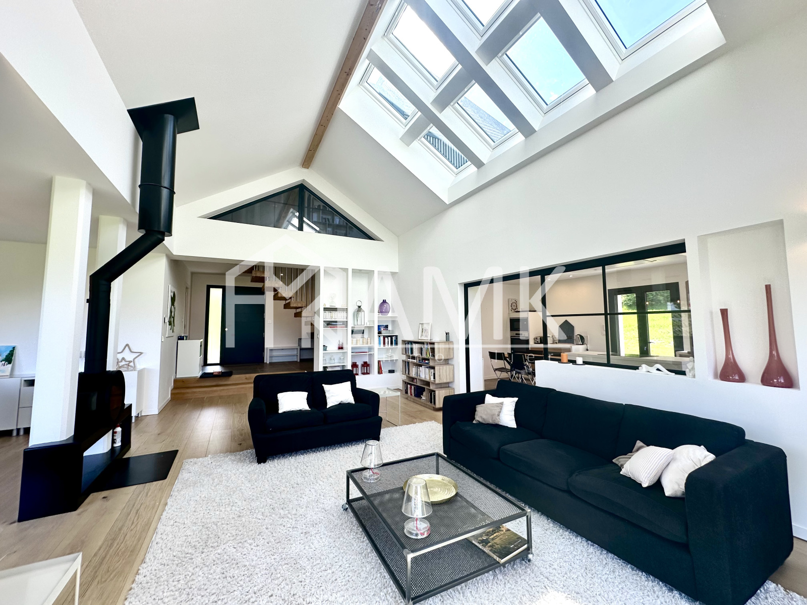 -grande pièce de vie avec hauteur sous plafond ;