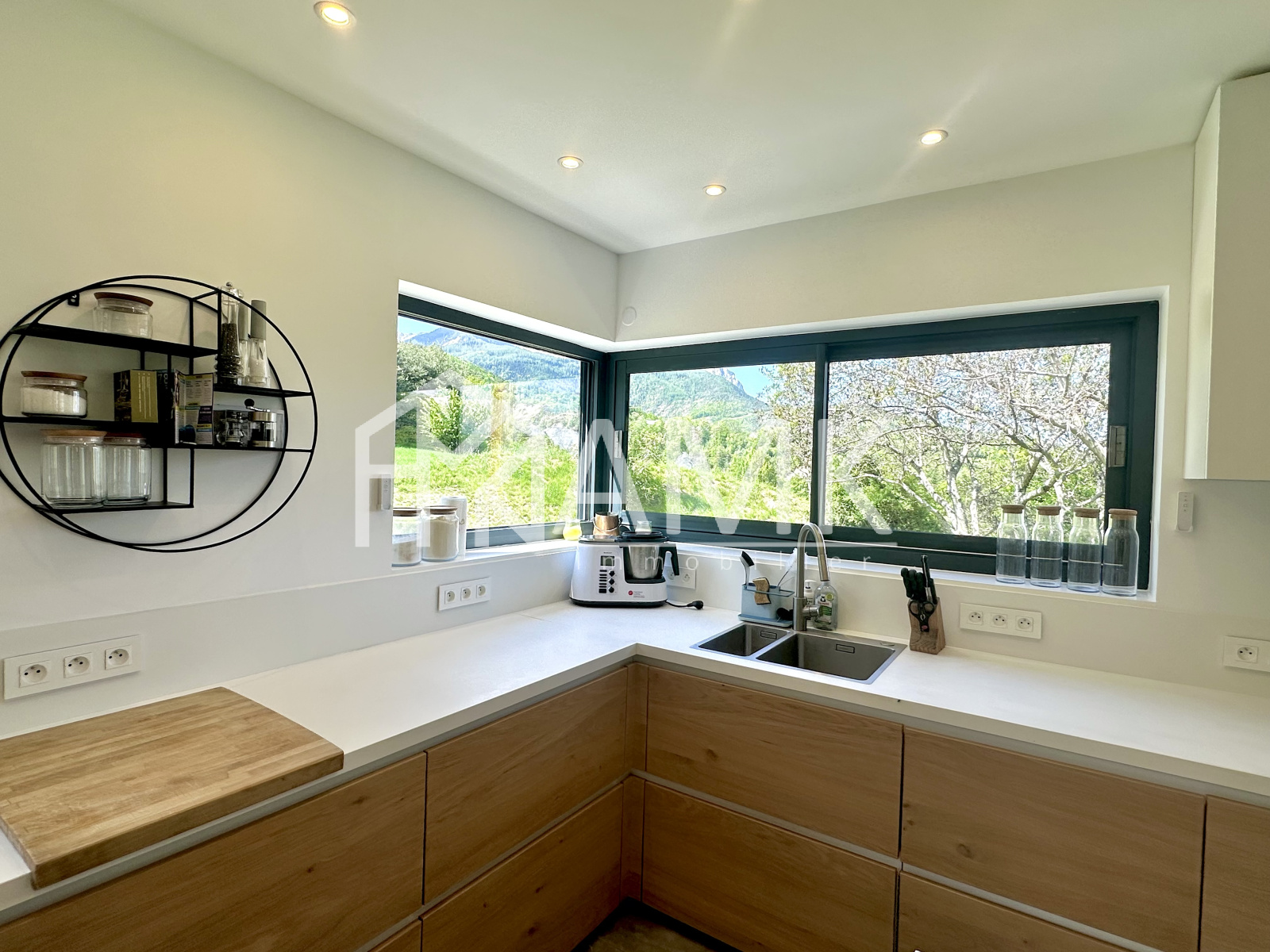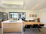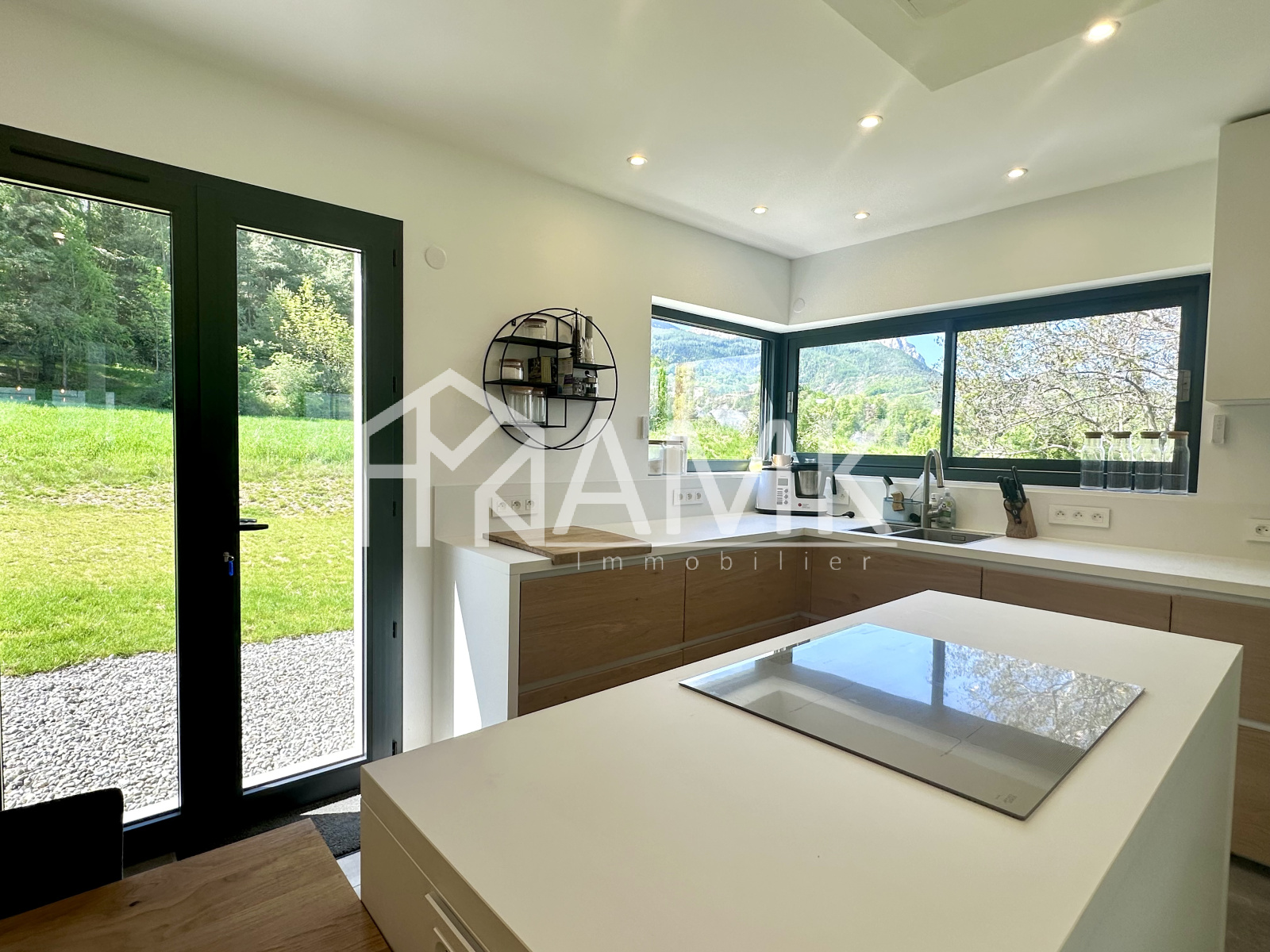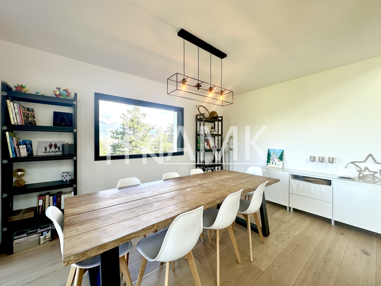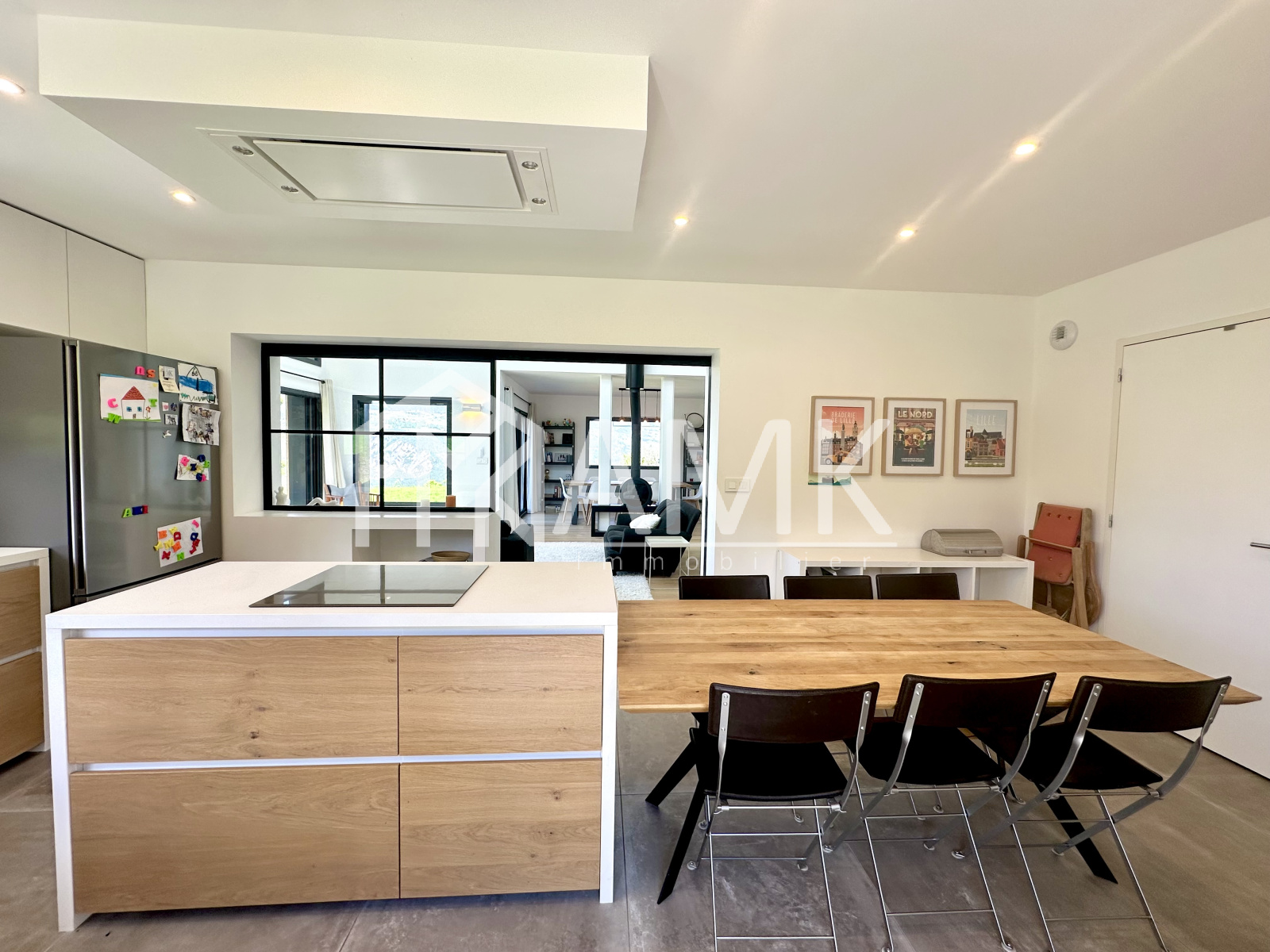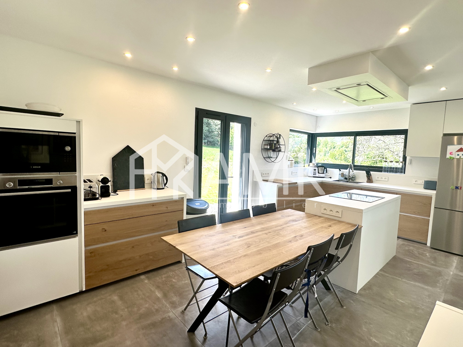 -cuisine équipée intégralement (four , réfrigérateur américain, plaque induction, grille pain, bouilloire, cafetière, lave vaisselle, ...) + table 6/7 personnes ;
