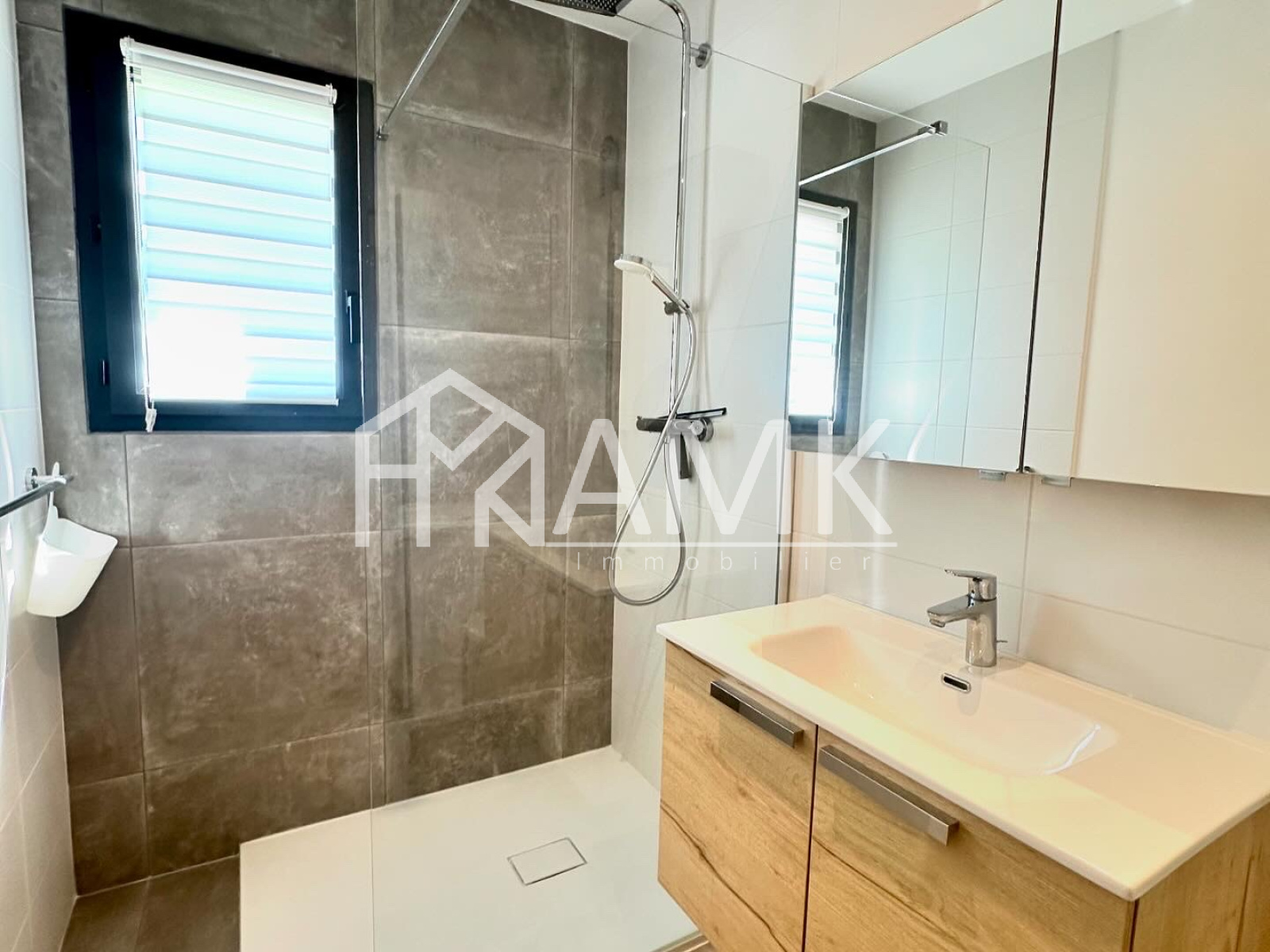 -une salle d'eau avec lavabo et douche italienne ;