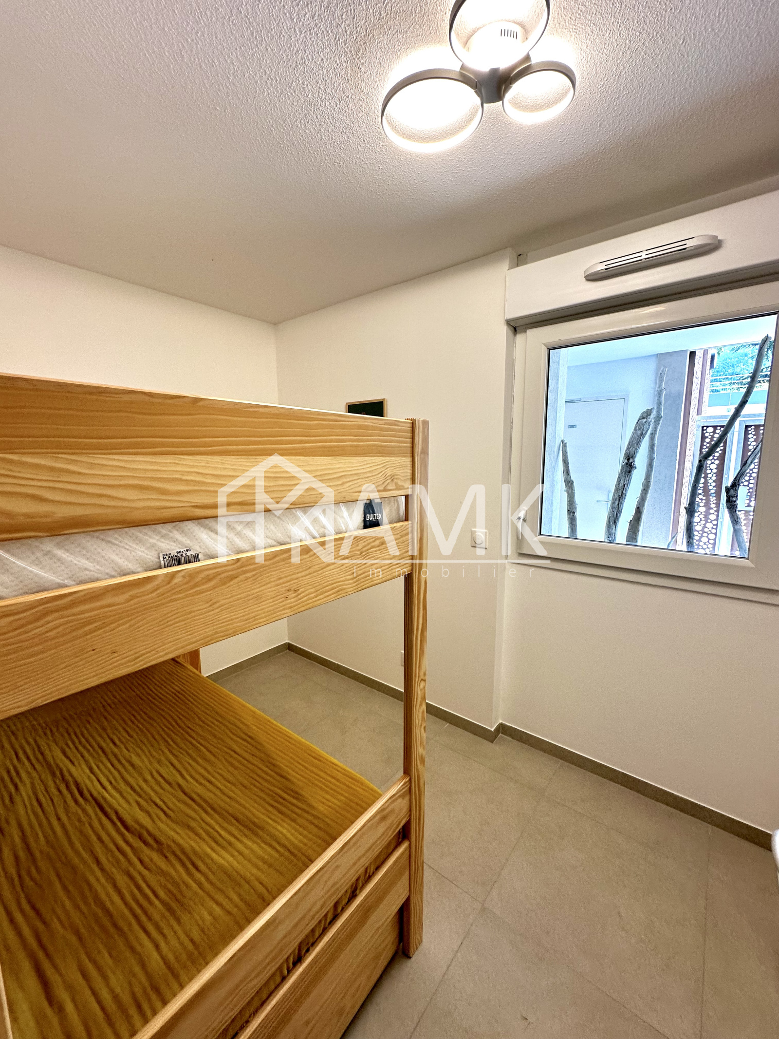 Chambre secondaire : Comprend des lits superposés avec trois matelas, idéale pour les enfants.