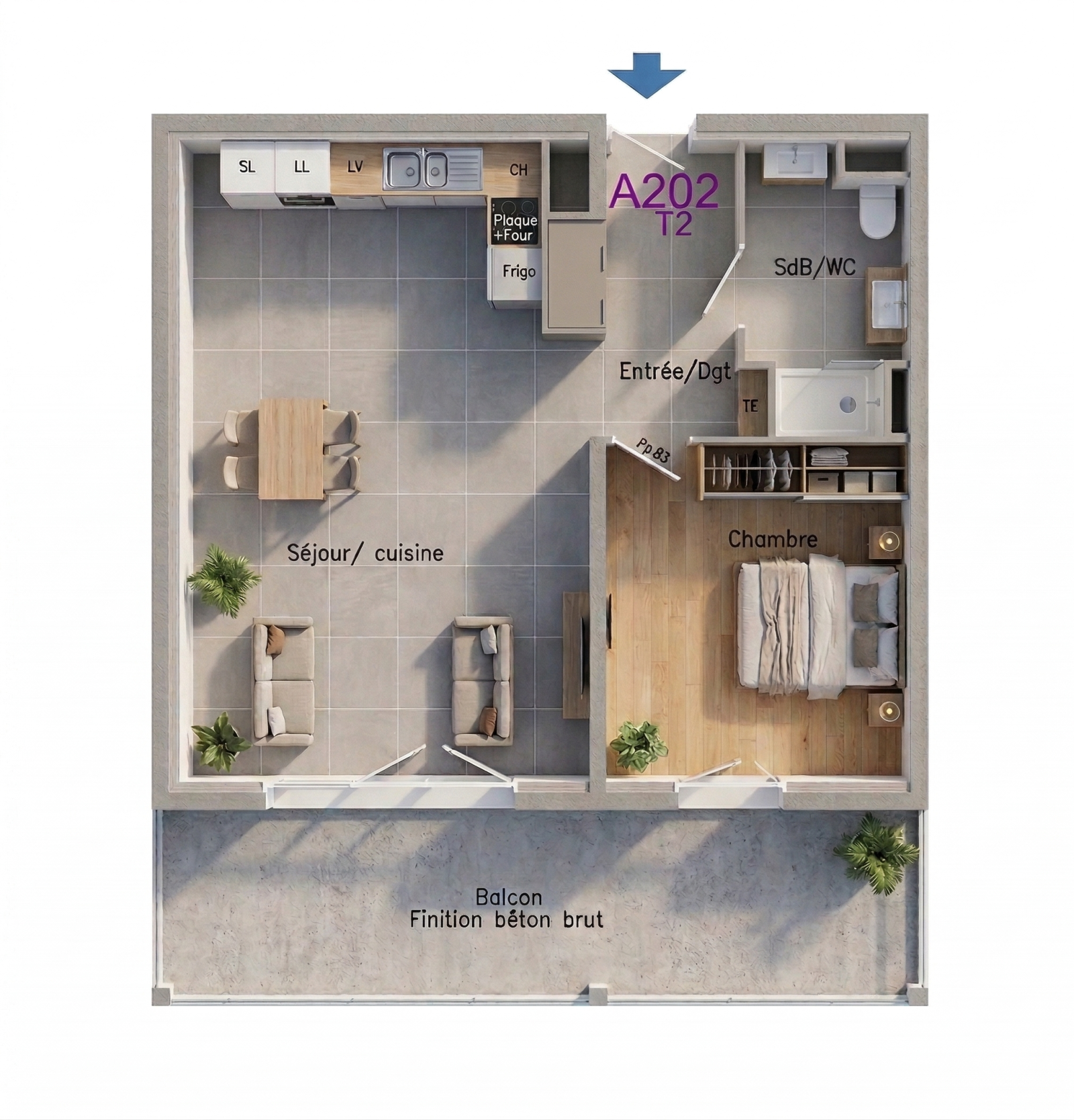 - Lot A203 : 75 m² + terrasse 21 m² – 210 532 €