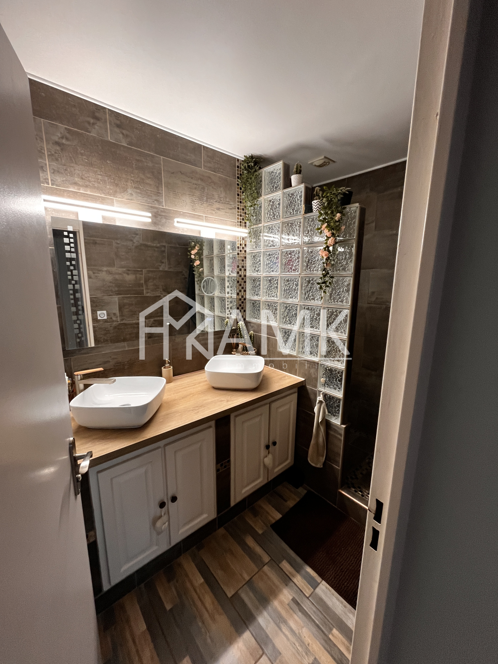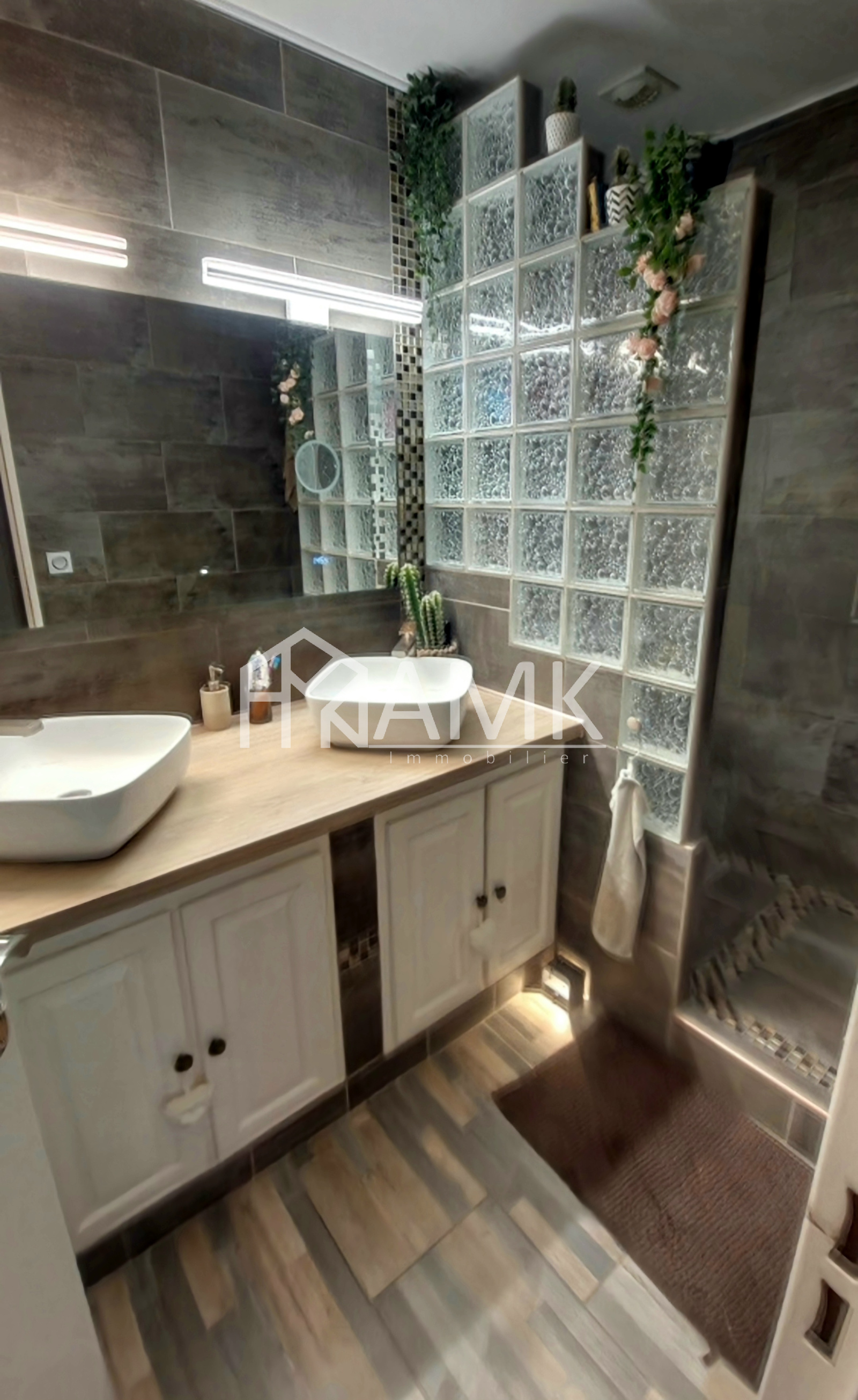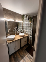 La salle d'eau, entièrement rénovée, apporte une touche contemporaine. Les WC séparés disposent d'un lavabo et d'un placard supplémentaire.